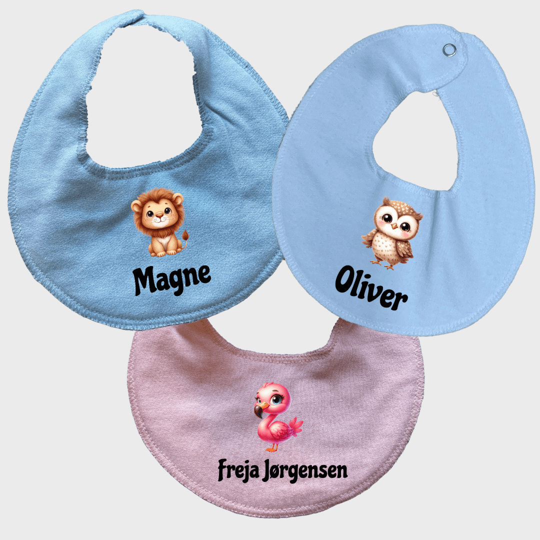 Med denne 3-pak hagesmække med navn får du en personlig og praktisk løsning til hverdagen. Du vælger selv navn og motiv, som trykkes ens på alle tre hagesmække, mens farverne frit kan kombineres i sky blue, rose og hvid.