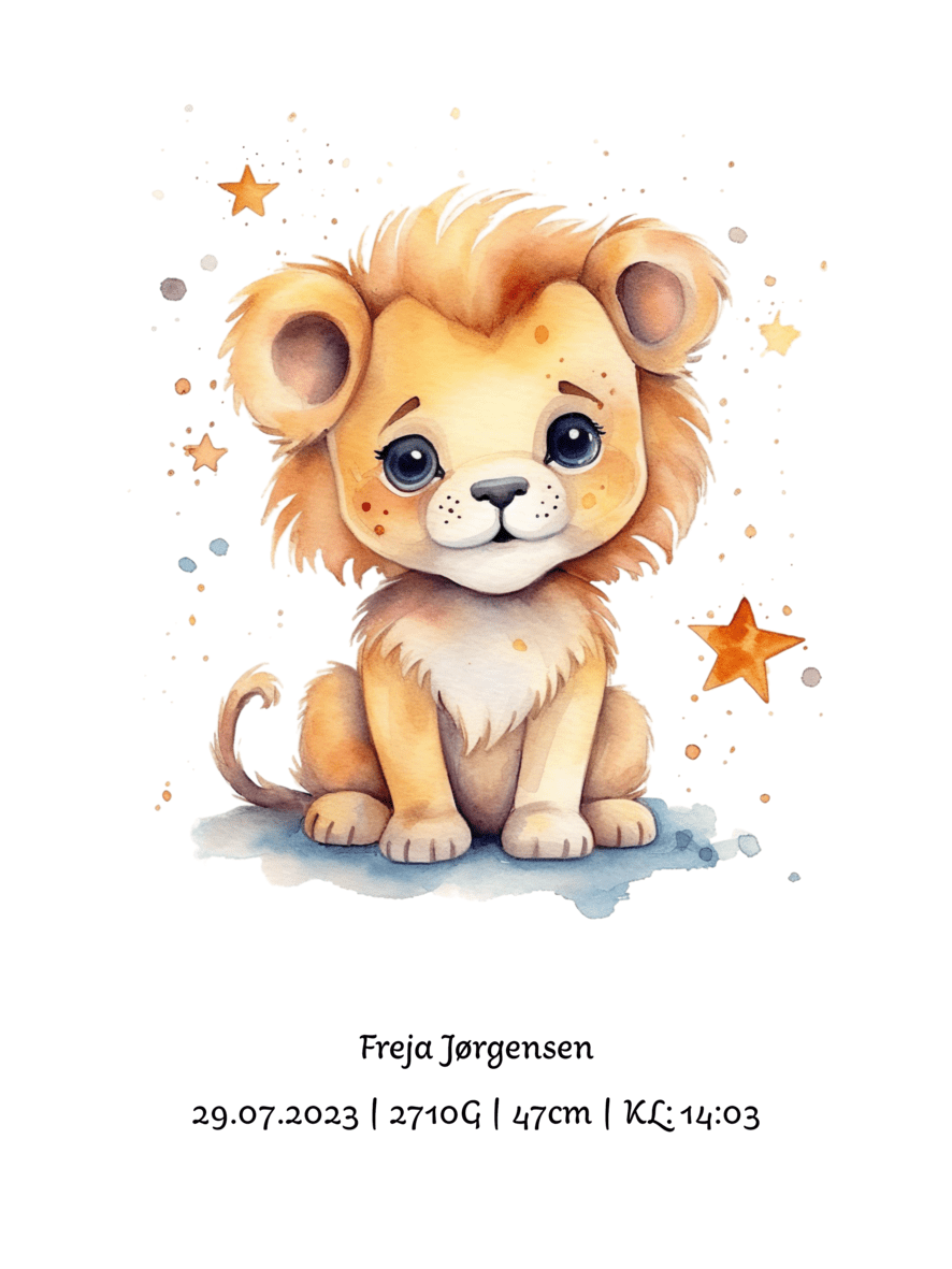 Denne personlige plakat kombinerer barnets stjernetegn med et sødt, børnevenligt motiv og personlige detaljer som navn, fødselsdato, klokkeslæt, vægt og længde.