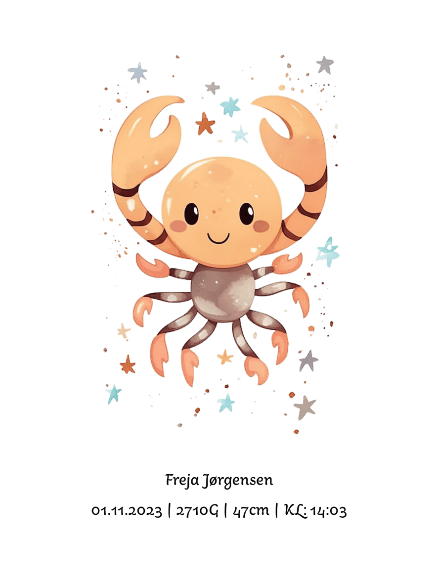 Denne personlige plakat kombinerer barnets stjernetegn med et sødt, børnevenligt motiv og personlige detaljer som navn, fødselsdato, klokkeslæt, vægt og længde.